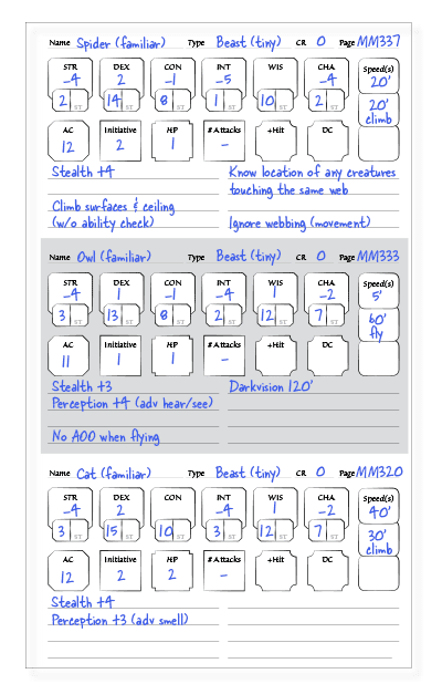 This 3-Up Minor Creature page from our Dungeons & Dragons 5th Edition Critters, Companions, Conjurations and Constructs (C4) Addon Pack is handy for keeping track of multiple, relatively simple creature statistic blocks. It’s particularly well suited for Familiars and the lower CR Druid Wild Shape forms, but it also makes a great place to keep […]